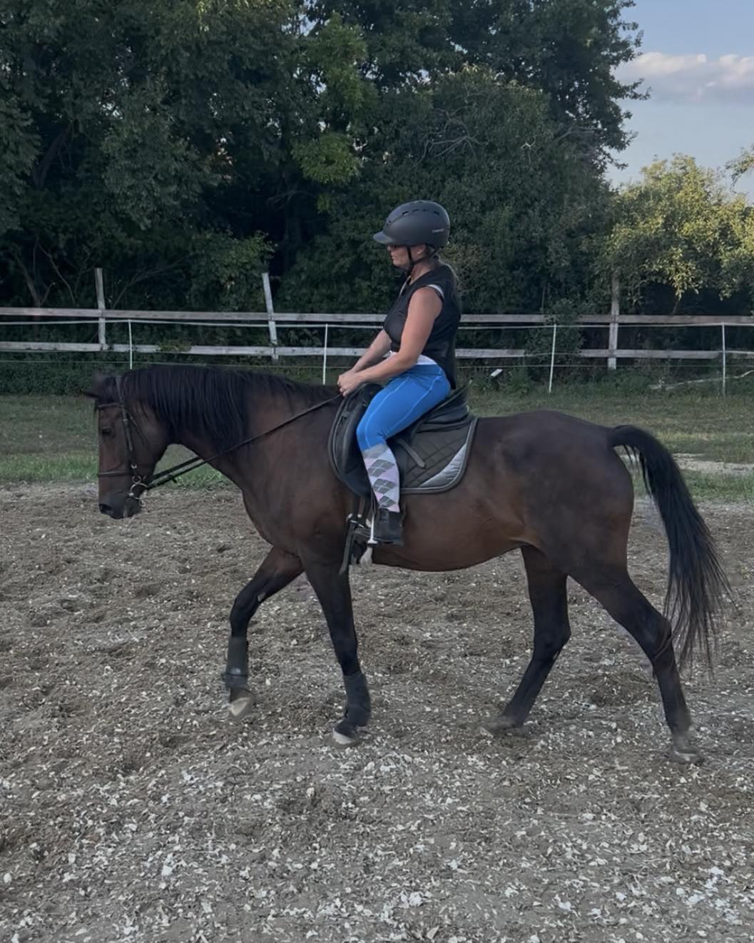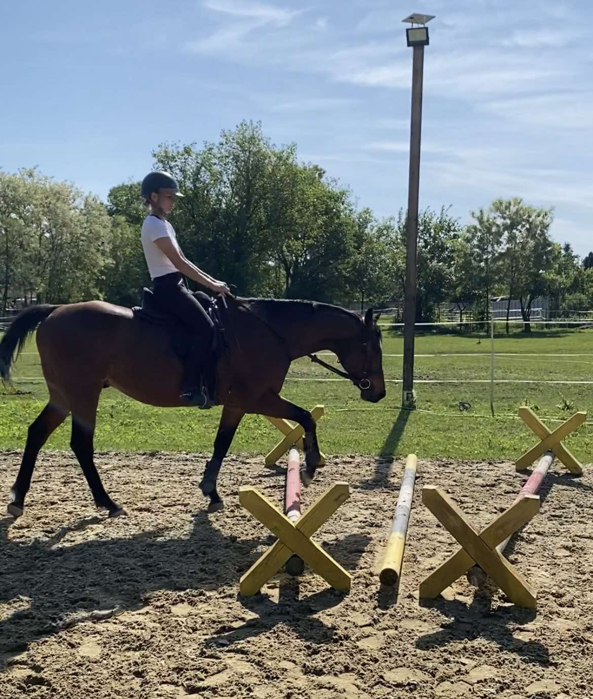 20x 40m alapterületű kivilágított négy évszakos lovaspálya cavalettivel, és szerény akadályparkkal áll a lovasok rendelkezésére.